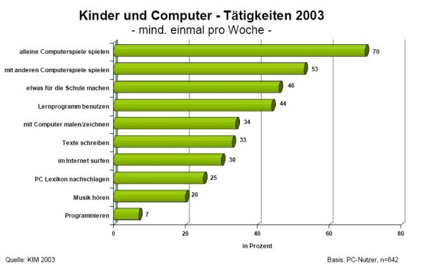 Zusammenfassend lässt sich sagen, dass der Computer wie die Videospielkonsole im Kinderzimmer der Normalfall geworden ist. Das ist ein an sich erst einmal nicht so kritisches Faktum, da Rechner und ihre möglichst kenntnisreiche Nutzung in Schule, Ausbildung und Beruf mittlerweile unabdingbare Voraussetzungen geworden sind. Und auch für Videospielgeräte gibt es sinnvolle Lernspiele. Nur beschränkt sich die Nutzung moderner Rechner und Konsolen bei weitem nicht auf pädagogisch wertvolle Programme und solche Anwendungen, die die Lern- und Arbeitsleistungen ihrer Nutzer beflügeln. Der medienpädagogische Forschungsverbund Südwest stellt fest: „Spielen ist die bei Kindern am häufigsten ausgeübte Tätigkeit am Computer“ (KIM 2003, 32). Und das gilt auch für Jugendliche.