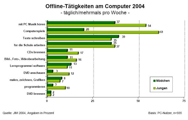 An dieser Stelle ein Wort zum Begriff „Spieler“: erstens sollte dabei die weibliche Form „Spielerin“ immer mitgedacht werden. Zweitens erlaube ich mir aber auch bewusst provokativ von „Spieler“ in der männlichen Form zu sprechen, da Jungen, wie wir eben schon bei der Folie zur Computernutzung Jugendlicher gesehen haben, sehr viel häufiger und länger als Mädchen spielen (JIM 2004, 26, s.a. KIM 2003, 35) und dann auch sehr viel eher zu Spielen mit Gewaltformen als wesentlichem Handlungselement greifen, als Mädchen dies tun (vgl. JIM 2004, 30).