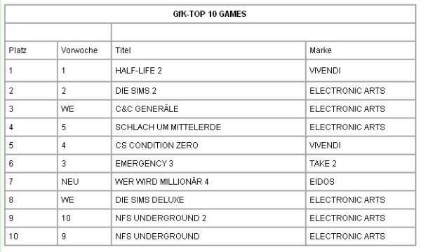 Spiele, bei denen die Gewaltanwendung im Vordergrund steht sind in dieser Tabelle: "Half-Life 2" (das in Deutschland nur in einer entschärften Version nicht indziert ist), "C&C Generäle", "Schlacht um Mittelerde" und "CS Condition Zero". Bei dieser Hitliste muss man beachten, dass auf ihr keine indizierten Spiele auftauchen dürfen. Indizierte Spiele, sind Spiele, die nicht an Kinder und Jugendliche verkauft werden dürfen, die aber auch in der Öffentlichkeit in keiner Weise beworben werden dürfen. Und das Erscheinen in einer Hitparade ist natürlich Werbung. Von den oben gezeigten Beispielen steht das Spiel „Doom“ auf dem Index. Es ist also unklar, in welchem Ausmaß indexierte Spiele im Umlauf sind.