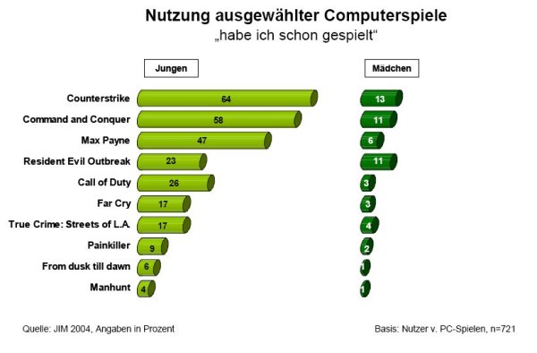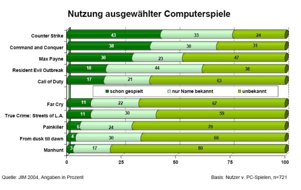 Haben Kinder und Jugendliche aber Kontakt zu derartigen Spielen? Eine ganze Reihe der Spiele mit besonders ausgeprägter Gewaltdarstellung sind den jungen Leuten auf legale Weise ja gar nicht zugänglich. Zu dieser Frage gibt es zumindest Ergebnisse aus den Befragungen von Jugendlichen. In der schon erwähnten Studie JIM 2004 war dies nämlich auch ein Thema. Zwar wurde von den eben vorgestellten Bildern nur das Spiel Counterstrike erfragt, die Ergebnisse sind aber übertragbar, da die Bilder ebenfalls austauschbar sind.